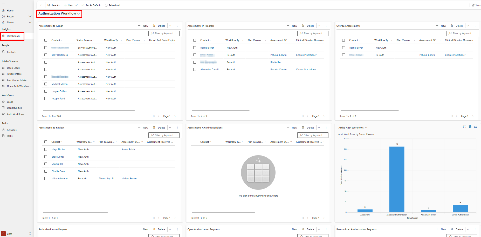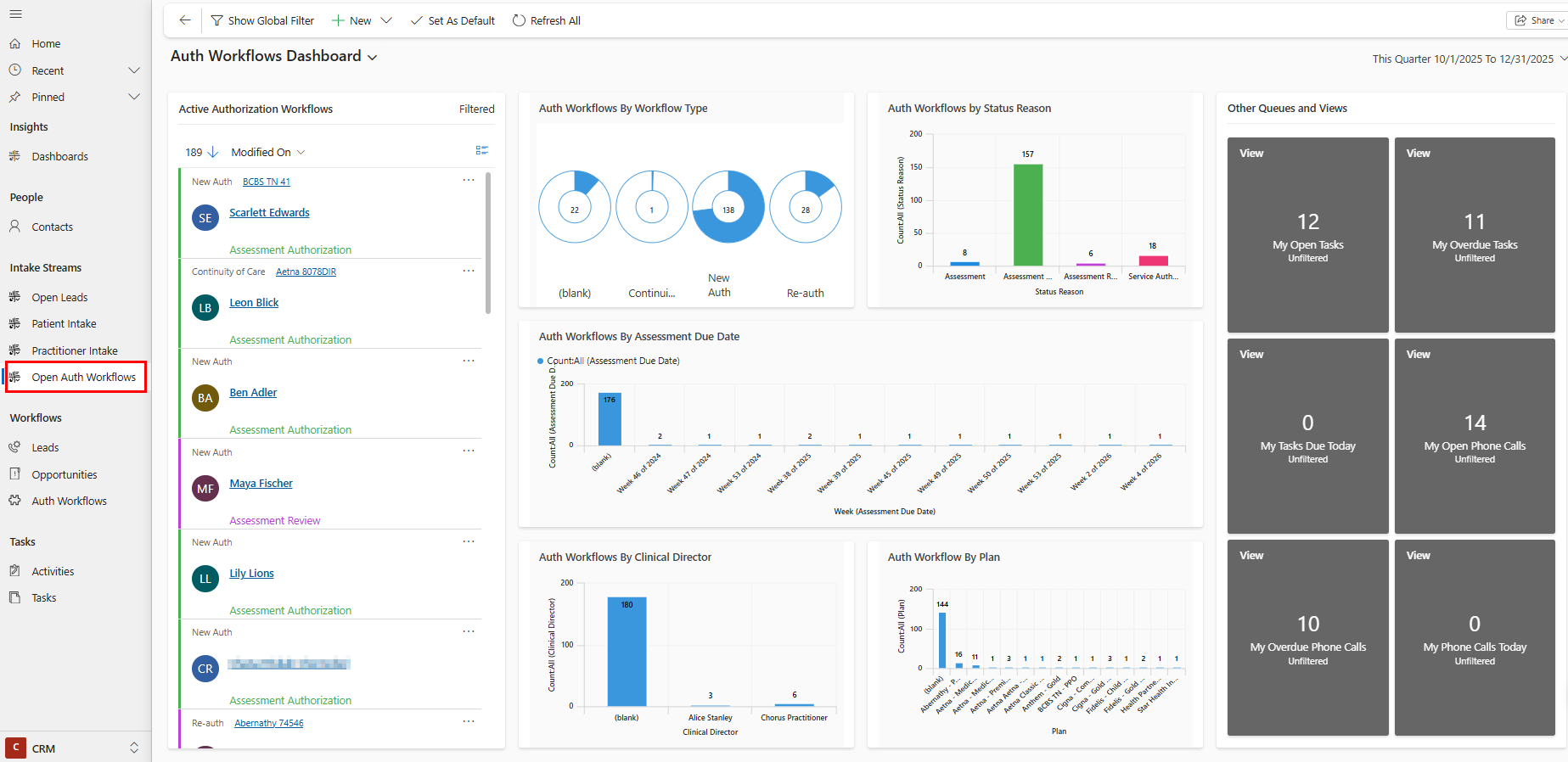Use the Open Auth Workflows Stream to efficiently work through open authorization workflows opportunities. Filter by any visual(s) on the dashboard to filter your stream and allow you to take next steps on open records easily: