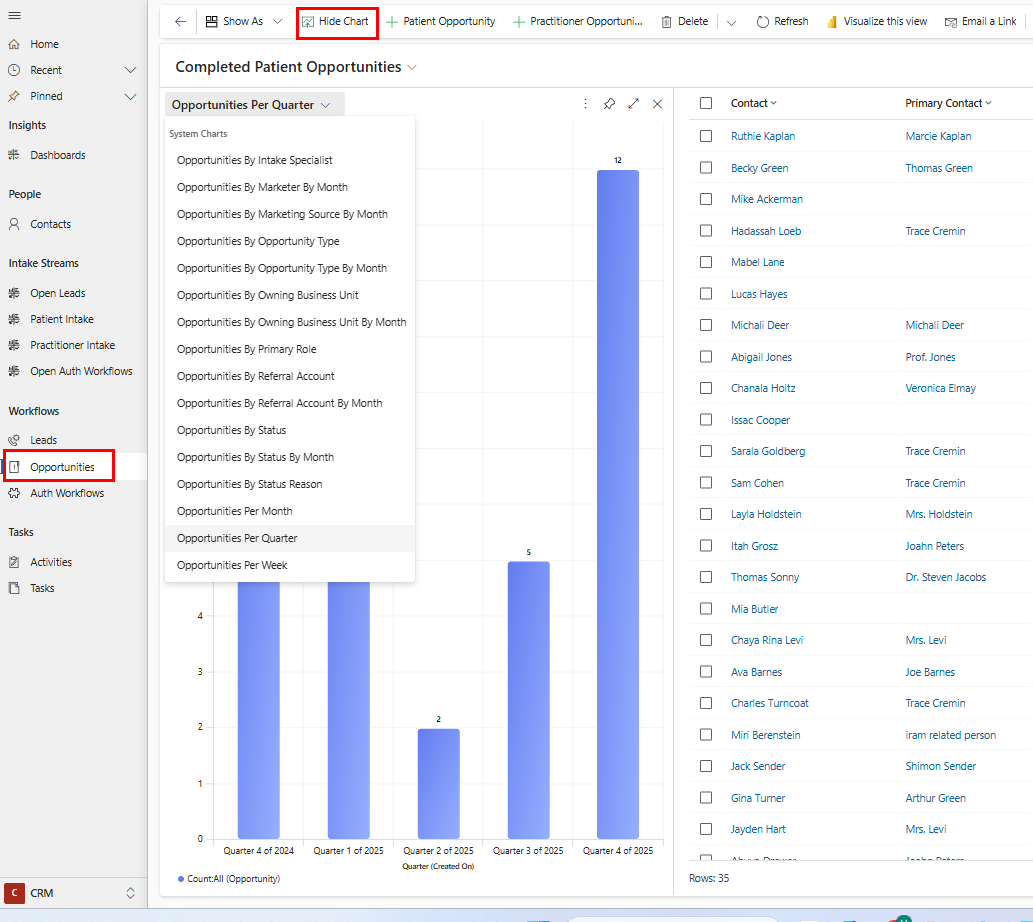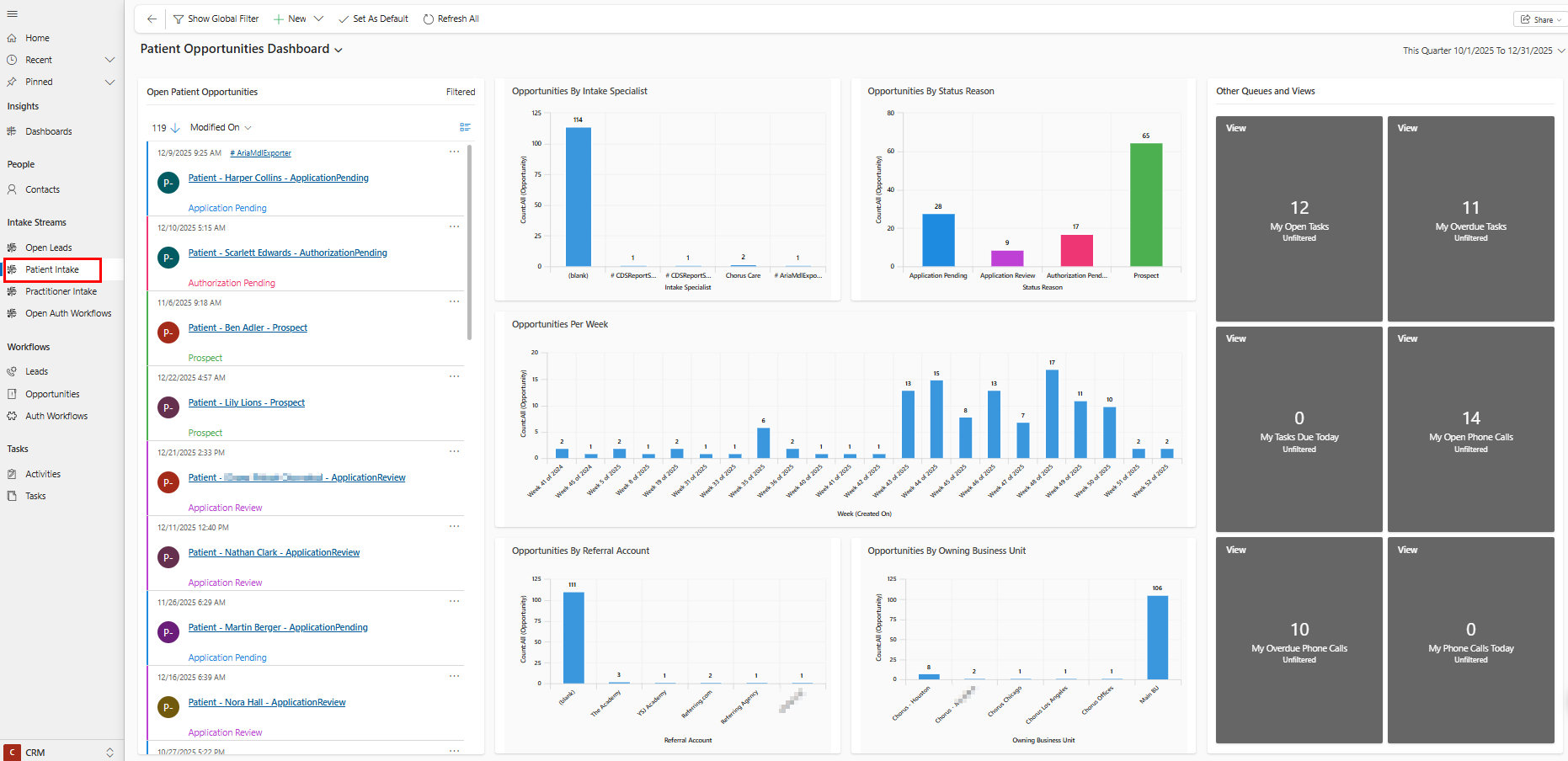 Use the Patient Intake Stream to efficiently work through open patient opportunities. Filter by any visual on the dashboard to filter your stream and allow you to take next steps on open records easily: