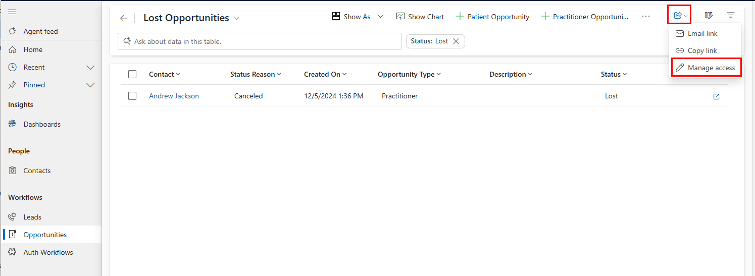 On the view you'd like to share, click the share button in the top right corner. Then click 'Manage access'.